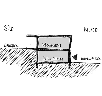 Hier befinden sich die Schlafräume im EG, während die Aufenthaltsräume im (Halb)Keller angeordnet sind. Dadurch kann man die Hanglage optimal nutzen. Der eingeschüttete, rückwärtige Bereich kann für Keller- und, Vorratsräume sowie Haustechnik und Hauswirtschaft optimal genutzt werden.